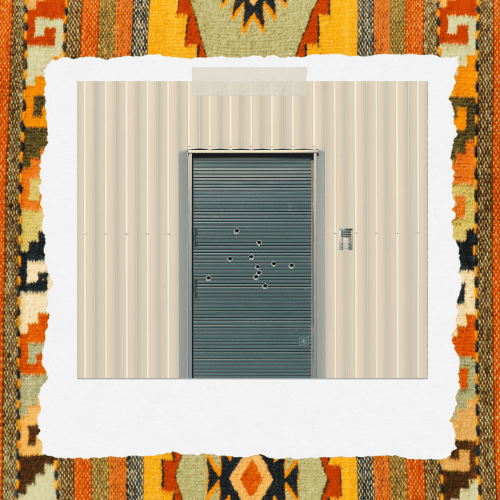 The door was metal with bullet holes all over it. It was locked which made sense considering the bullet holes.